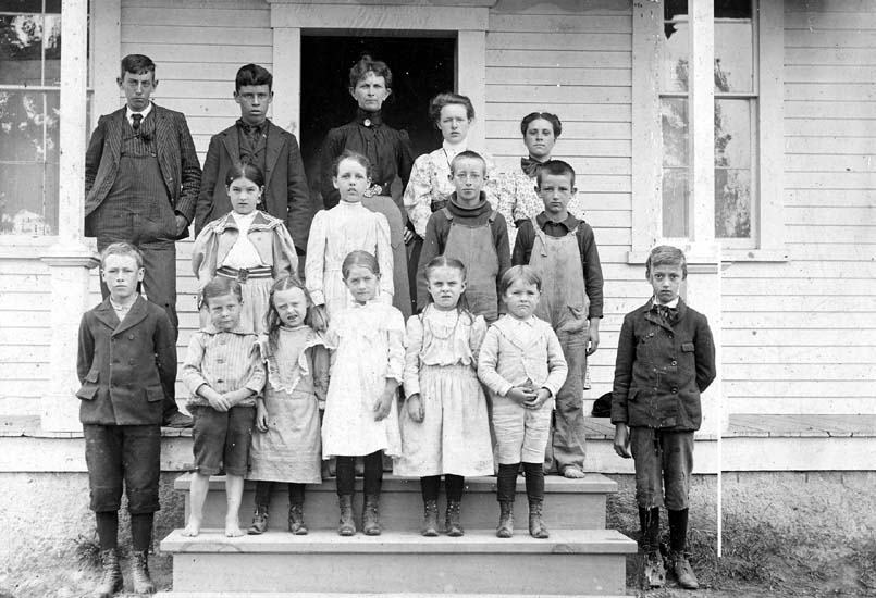 Center Hill School around 1900. Cora Brown, teacher.Front row - Edwin L. Bunker; Wallace Longa; Bertha Hall; Mabel Chesley; Blanche C. Philbrick; John G. Chesley and Charles Rogers.Middle row - Eleanora Chesley (Nutter), Edna Fogg (Cox), Arthur Sherburne; Leland Edwards.Back row - Leon Marston; Roland Hall; Cora Brown, teacher; "Mollie" Knowles (Barton); and Myra Longa. |